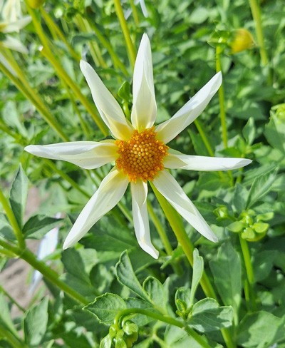 Elegant open-centred white star dahlia with strong pollinator value. Long flowering for naturalistic borders and cutting.